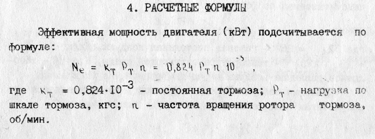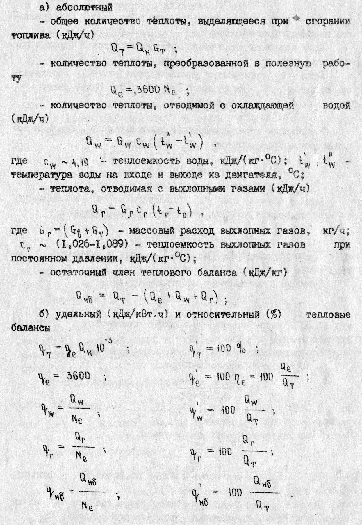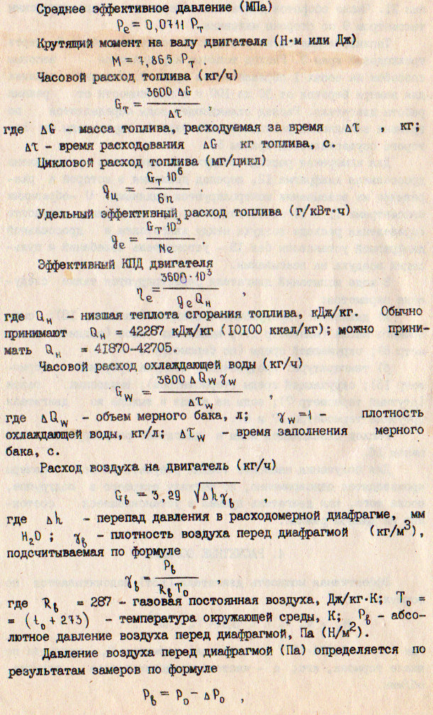 Для измерения расхода воздуха на двигатель установлена дроссельная диафрагма 12, перепад давления в которой и разрежение на всасывании контролируются водяными U-образными манометрами 11 и 10 соответственно. Для повышения точности определения расхода воздуха между двигателем и дроссельной диафрагмой установлен бак 13 - успокоитель колебаний и пульсаций воздуха на всасывании. В ходе испытания двигателя регистрируются также следующие параметры: а) давление: продувочного воздуха (манометр 18); смазочного масла (манометр 19); выхлопных газов (водяной мано- метр 8); окружающей среды (по барометру); б) температура: продувочного воздуха (ртутный термо- метр 15); окружающей среды (термометром); выхлопных газов (ртутный термометр 7); воды на входе и выходе из двигателя (ртутные термометры 17 и 6). Расход охлаждающей воды в двигателе регулируется клапаном 16. Для получения наиболее точных результатов все замеры производятся одновременно, по сигналу старшего в подгруппе, после того, как двигатель пришел в установившееся состояние на данном режиме.