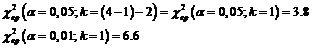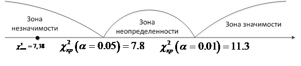 k – это число степеней свободы. Для данной задачи оно вычисляется как (число строк – 1)*(число столбцов - 1). Критические значения определяются по специальной таблице распределения Строим ось значимости: 1. Рисуем прямую линию (без указания направления оси) 2. Отмечаем на ней критические значения (слева для 0,05, справа для 0,01). Обозначаем зоны значимости. 3. Определяем направление оси. 4. Отмечаем эмпирическое значение критерия и делаем вывод в какую зону оно попадает.