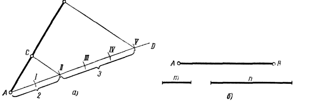 Деление отрезка AB на две части, находящиеся в отношении AC:CB= 2:3 (рисунок 20, a). Через точку A проводят под произвольным углом к заданному отрезку прямую AD. На этой прямой от точки A откладывают пять (2+3) равных отрезков произвольной длины. Точки B и V соединяют прямой линией. Через точку II проводят прямую, параллельную BV, до пересечения ее с отрезком AB в точке C. Точка C делит отрезок AB в отношении 2:3. Если отношение задано не цифрами, а в отрезках m:n, то на вспомогательной прямой AD вместо отрезков произвольной длины откладывают отрезки m и n. Подобное построение учащемуся предлагается проделать самостоятельно, взяв размеры с рисунка 20, б.