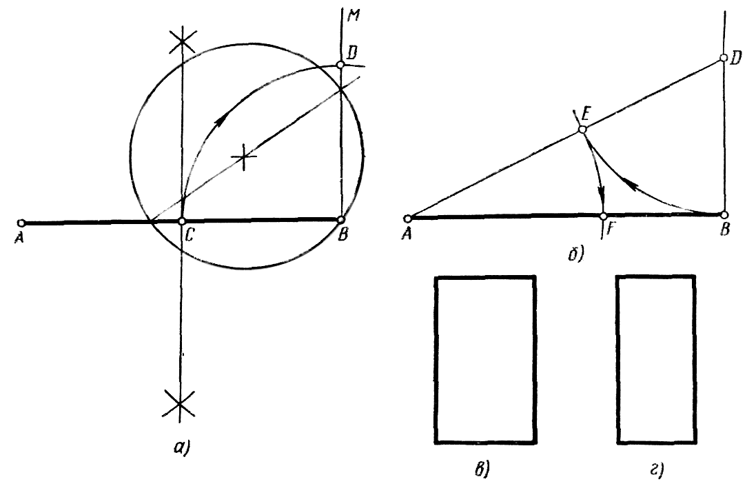 Деление отрезка AB в среднем и крайнем отношении (рисунок 21). Отрезок AB делят в точке C пополам и через один из его концов, например точку B, проводят прямую BM, ему перпендикулярную (рисунок 21, а). От точки B на перпендикуляре откладывают отрезок BD = BC. Точки A и D соединяют прямой (рисунок 21, б). На отрезке AD получают точку E при помощи дуги радиуса DB с центром в точке D. Из точки A как из центра проводят дугу радиусом AE, которая пересечет отрезок AB в точке F. Точка F является точкой деления отрезка AB в среднем и крайнем отношении, так как Разобранную пропорцию часто называют «золотым сечением». Это название связано с тем, что в пропорциях человеческого тела, в формах животных, отличающихся изяществом, среди творений мастеров архитектуры и прикладного искусства – всюду встречаются пропорции, подчиненные закону о среднем и крайнем отношениях. Деление отрезка в среднем и крайнем отношениях позволяет подобрать наилучшие пропорции для одного предмета или выбрать соразмерность нескольких предметов. Возьмем для примера прямоугольник с отношением сторон, равным построенной пропорции (рисунок 21, в), и сравним его с другим прямоугольником (рисунок 21, г), у которого эта пропорция нарушена. Нетрудно заметить, что пропорции первого прямоугольника более приятны для глаза. Простейшее применение пропорции «золотого сечения» можно наблюдать в форматах книг, альбомов, размерах открыток и т. д.