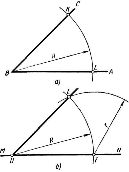 Построение угла, равного данному. Пусть требуется на прямой MN при точке D построить угол, равный углу ABC (рисунок 22). Произвольным радиусом R проводят две дуги: одну из вершины угла ABC, пересекающую стороны его в точках К и L (рисунок 22, а), другую из точки D, пересекающую прямую MN в точке F (рисунок 22, б). Из точки F радиусом r=KL проводят дугу до пересечения с дугой радиуса R в точке E. Проводя через точки D и E прямую, получают угол EDF, равный заданному ABC.