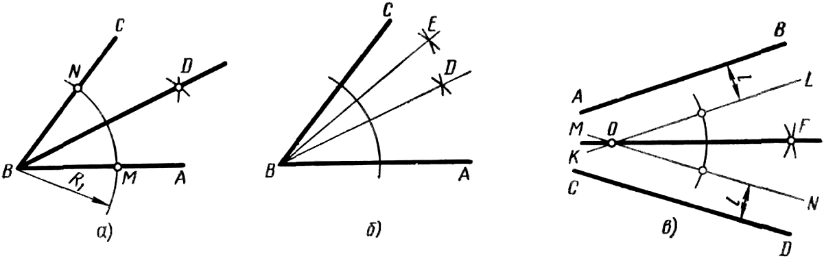 Деление угла пополам (рисунок 26, а). Из вершины В угла ABC произвольным радиусом R1 проводят дугу до пересечения ее со сторонами угла в точках М и N. Затем из точек M и N проводят дуги радиусом >R1 до взаимного пересечения их в точке D. Прямая BD разделит данный угол пополам. Деление угла на 4, 8 и т. д. равных частей осуществляется последовательным делением пополам каждой части угла (рисунок 26, б).