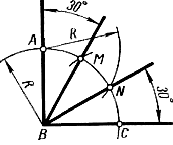 В том случае, когда угол задан сторонами, не пересекающимися в пределах чертежа, например AB и CD на рисунке 26, в, деление угла пополам выполняют так. На произвольном, но одинаковом расстоянии l от сторон угла проводят прямые KL || AB и MN || CD и продолжают их до пересечения в точке О. Полученный угол LON делят пополам прямой OF. Прямая OF разделит пополам также и заданный угол. Деление прямого угла на три равные части (рисунок 27). Из вершины прямого угла – точки В проводят дугу произвольным радиусом R до пересечения ее с обеими сторонами угла в точках A и C. Тем же радиусом R из точек A и С проводят дуги до пересечения с дугой AC в точках М и N. Прямые, проведенные через вершину угла В и точки М и N, разделят прямой угол на три равные части.