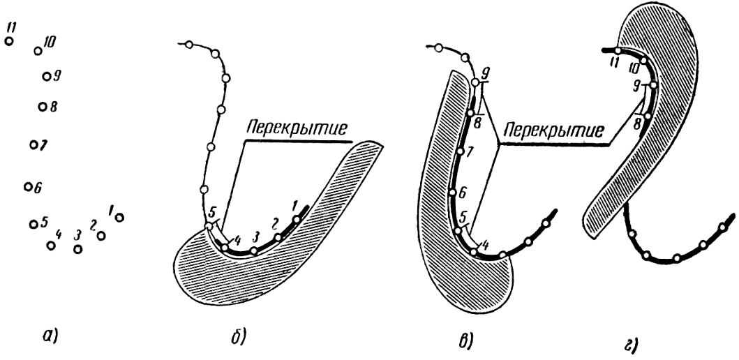 Пусть на рисунке 64, а заданы точки 1, 2,..., 11, принадлежащие некоторой кривой. Предварительно эти точки от руки с помощью мягкого карандаша соединяют тонкой, по возможности более плавной кривой линией (рисунок 64, б). Желательно, чтобы расстояние между точками лекальной кривой не превышало 15 мм. Если же две соседние точки кривой расположены далеко друг от друга и характер кривой не совсем ясен, то следует построить дополнительно еще одну или две точки.