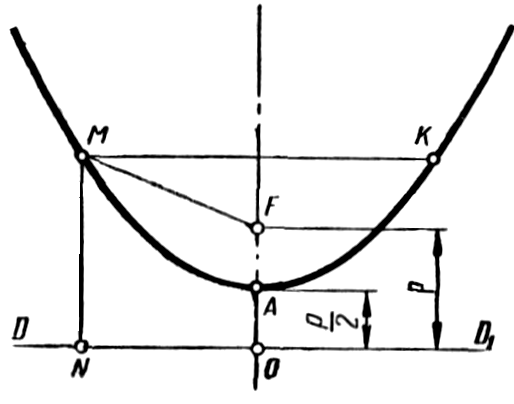 Рисунок 68 Парабола (рисунок 69) – плоская кривая, каждая точка которой удалена на одинаковое расстояние от заданной прямой DD1, называемой директрисой, и точки F – фокуса параболы. Например, для точки М отрезки MN (расстояние до директрисы) и MF (расстояние до фокуса) равны, т. е. MN = MF. Парабола имеет форму разомкнутой кривой с одной осью симметрии, которая проходит через фокус параболы – точку F и расположена перпендикулярно к директрисе DD1. Точна A, лежащая на середине отрезка OF, называется вершиной параболы. Расстояние от фокуса до директрисы – отрезок OF = 2´OA – обозначают буквой р и называют параметром параболы. Чем больше параметр р, тем резче ветви параболы отходят от ее оси. Отрезок, заключенный между двумя точками параболы, расположенными симметрично относительно оси параболы, называется хордой (например, хорда MК).