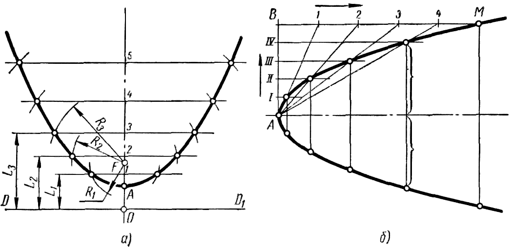 Построение параболы по ее директрисе DD1 и фокусу F (рисунок 70, а). Через точку F перпендикулярно к директрисе проводят ось параболы до пересечения ее с директрисой в точке О. Отрезок OF = p делят пополам и получают точку A – вершину параболы. На оси параболы от точки A откладывают несколько постепенно увеличивающихся отрезков. Через точки деления 1, 2, 3 и т. д. проводят прямые, параллельные директрисе. Приняв фокус параболы за центр, описывают дуги радиусом R1 =L1 до пересечения с прямой, проведенной через точку 1, радиусом R2 = L2 до пересечения с прямой, проведенной через точку 2, и т. д. Полученные точки принадлежат параболе. Вначале их соединяют тонкой плавной линией от руки, затем обводят по лекалу. Построение параболы по ее оси, вершине А и промежуточной точке М (рисунок 70, б). Через вершину A проводят прямую, перпендикулярную к оси параболы, а через точку М – прямую, параллельную оси. Обе прямые пересекаются в точке B. Отрезки AB и BM делят на одинаковое число равных частей, а точки деления нумеруют в направлениях, указанных стрелками. Через вершину A и точки 1, 2, 3, 4 проводят лучи, а из точек I, II, III, IV – прямые, параллельные оси параболы. На пересечении прямых, обозначенных одинаковым номером, расположены точки, принадлежащие параболе. Обе ветви параболы одинаковы, поэтому другую ветвь строят симметрично первой с помощью хорд.