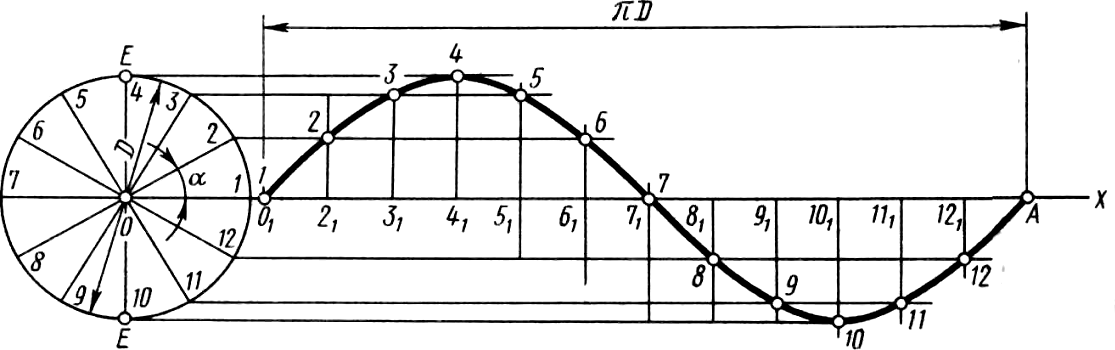 Синусоида. Синусоидой называется проекция траектории точки, движущей с я по цилиндриче с кой винтовой линии, на плоскость, параллельную оси цилиндра. Движение точки складывается из равномерно–вращательного движения (вокруг оси цилиндра) и равномерно–поступательного (параллельно оси цилиндра). Синусоида – это плоская кривая, которая показывает изменение тригонометрической функции синуса в зависимости от изменения величины угла. Для построения синусоиды (рисунок 76) через центр О окружности диаметра D проводят прямую ОХ и на ней откладывают отрезок O1A, равный длине окружности