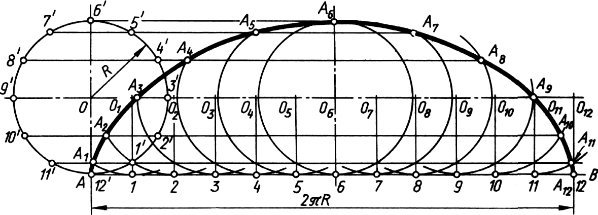 Делят заданную окружность на 12 равных частей (точки 1', 2', 3',..., 12'). Если точка A переме с тит с я в положение A12, то отрезок AA12 будет равен длине заданной окружно с ти, т. е. Эпициклоида строится следующим образом. На рисунке 79 изображены производящая окружность радиу с а R с центром O0, начальная точка A на ней и дуга направляющей окружно с ти радиу с а R1, по которой катит с я окружность. Построение эпициклоиды аналогично построению циклоиды, а именно: делят заданную окружность на 12 равных частей (точки 1', 2', 3',...,12'), каждую часть этой окружности откладывают от точки A по дуге АВ 12 раз (точки 1, 2, 3,..., 12) и получают длину дуги AA12. Эту длину можно определить с помощью угла Далее из центра О радиусом, равным OO0, наносят линию центров производящей окружности и, проводя радиусы 01, 02, 03,...,012, продолженные до пересечения с линией центров, получают центры О1, О2,..., O12 производящей окружности. Из этих центров радиусом, равным R, проводят окружности или дуги окружностей, на которых строят и с комые точки кривой; Так, для получения точки A4с ледует прове с ти дугу окружно с ти радиусом O4' до пересечения с окружностью, проведенной из центра O4. Аналогично строятся и другие точки, которые затем соединяются плавной кривой.