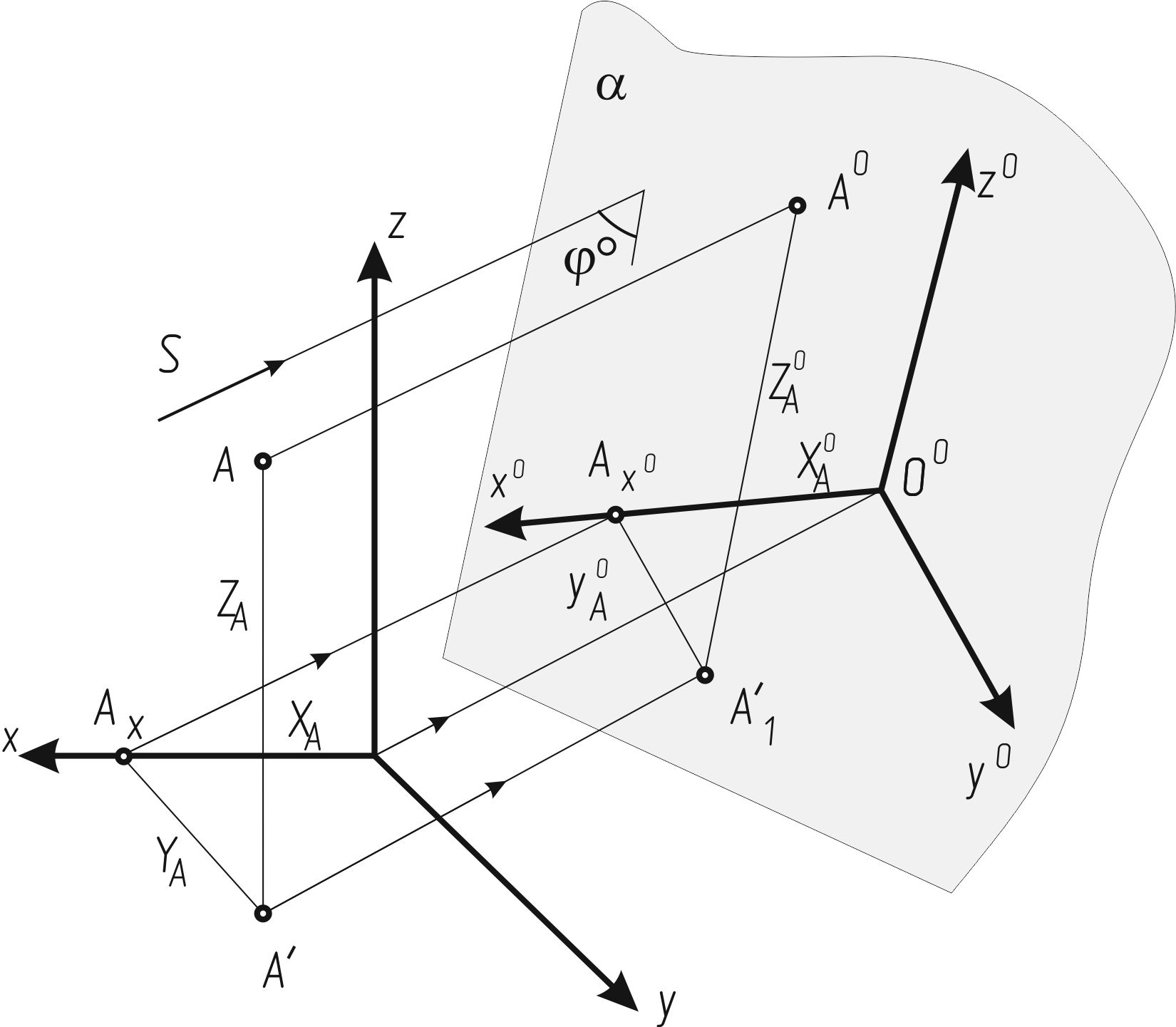 На рисунке 117 обозначено: a — картинная (аксонометрическая) плоскость; Оx, Оy, Оz — натуральные (декартовы) оси координат; S — направление проецирования; jo — угол проецирования; Оx, Оy, Оz — проекции натуральных осей координат на картинную плоскость — аксонометрические оси; Аo1 — аксонометрическая проекция точки А; А'1 — вторичная проекция (горизонтальная) точки А. Для определения точки А на аксонометрической проекции (в аксонометрии) необходимо кроме аксонометрической проекции этой точки иметь ее вторичную проекцию, например, горизонтальную А1, причем прямая АoА'1 должна быть параллельна аксонометрической оси zo. Аксонометрическая проекция точки А и ее вторичная проекция А1 (рисунок 118) однозначно определяют положение точки в пространстве, что делает аксонометрическую проекцию обратимой. Если вторичная проекция не задана, ее можно будет задать произвольно, например, в точке А'2, и тогда координаты XoA, YoA, ZoA изменяются.