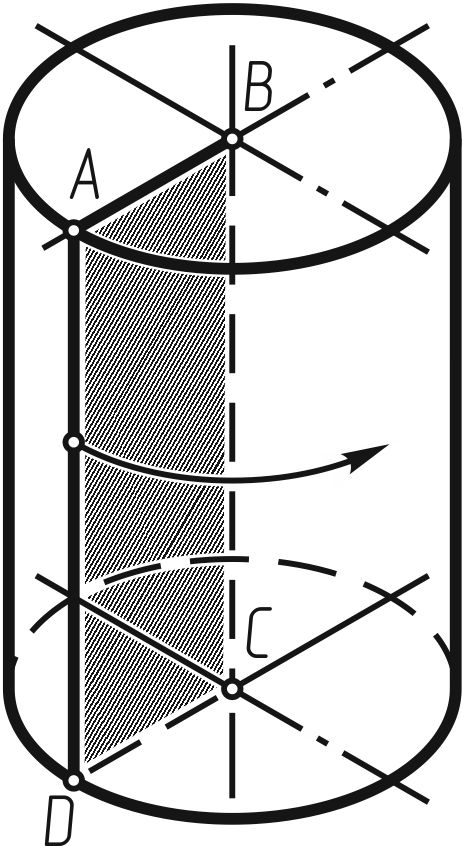 Прямой круговой цилиндр можно также рассматривать как тело, полученное при вращении какого-либо прямоугольника ABCD вокруг одной из его сторон, например, ВС (рисунок 136). Сторона ВС является осью вращения, а сторона AD — образующей цилиндра. Две другие стороны обозначат основания цилиндра.