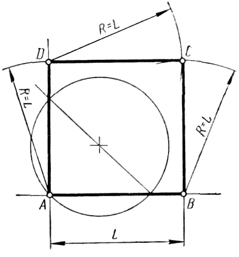 Построение квадрата по данной его стороне L (рисунок 34). На произвольной прямой откладывают отрезок AB, равный стороне квадрата L. Из любого конца отрезка, например из точки A, восстанавливают перпендикуляр и на нем откладывают отрезок AD = L. Затем из точек B и D как из центров проводят дуги радиусом R = L и на пересечении их отмечают точку С. Соединив прямыми точку C с точками B и D, получают квадрат с заданной стороной L.
