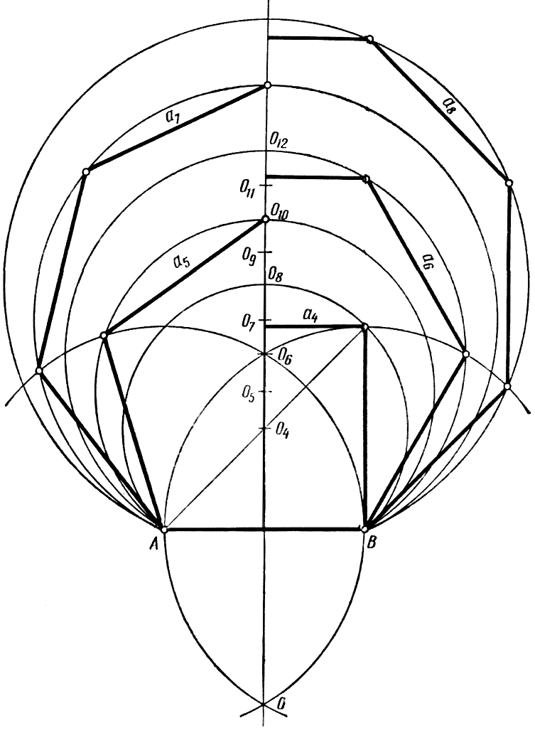 Приближенный способ построения правильных многоугольников данной сторонеAB (рисунок 37). Изложенный ниже способ заключается в том, что правильный многоугольник строят как вписанный в окружность. Из концов отрезка АВ радиусом, равным этому отрезку, проводят две дуги до взаимного пересечения их в точках О и О6. Из точек A и В к отрезку AB восстанавливают перпендикуляры, и на пересечении их с проведенными дугами получают две вершины квадрата (на рисунке 37 отмечена одна из них). Центр O4 окружности, описанной около квадрата, расположен в точке пересечения диагонали квадрата с вертикальной прямой OO6. Для построения вписанного пятиугольника отрезок O4O6 делят пополам в точке O5 и из нее как из центра описывают окружность радиусом, равным отрезку O5A. Сторона AB пять раз уложится на этой окружности. Центры окружностей, в которые сторона AB укладывается 8, 10, 12 и т. д. раз, расположены в точках пересечения прямой OO6 с окружностями соответственно радиусов O4A, О5А, О6А и т. д. Разделив пополам отрезки O6O8, O8O10, O10O12 и т.д., получают точки O7, O9, O11 и т. д., являющиеся центрами окружностей, в которые сторона AB укладывается 7, 9, 11 и т. д. раз. Радиусы этих окружностей равны O7A, O9A, O11A и т.д.