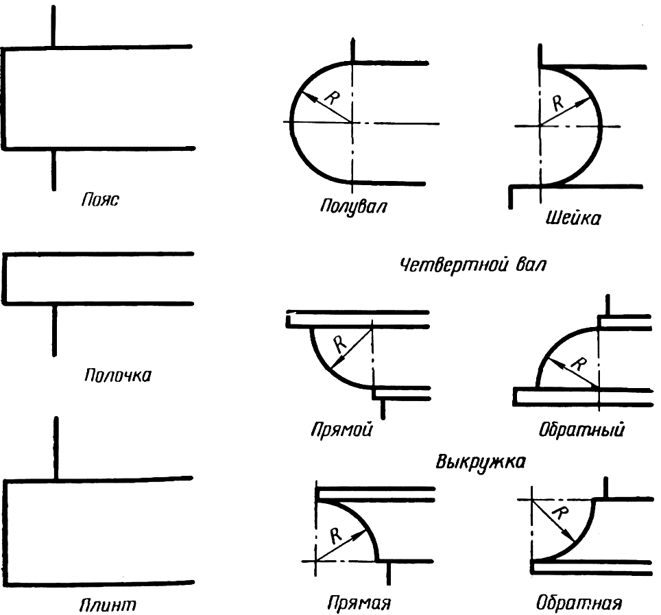 Многие здания снаружи и внутри имеют различные архитектурные украшения. Профиль архитектурных украшений складывается из элементов, называемых архитектурными обломами. Архитектурные обломы украшают не только здания. Их можно увидеть в контуре постаментов, декоративных ваз, мебели и т. п. По форме архитектурные обломы могут быть прямолинейные (рису-нок 55) и криволинейные (рисунки 56, 57). Криволинейные обломы, такие как полувал, шейка, прямой и обратный четвертной вал, прямая и обратная выкружка (рисунок 56), очерчены при помощи одной дуги, и способ их построения понятен из чертежа. Более сложные криволинейные обломы состоят из двух дуг. К ним относятся: гусёк прямой и обратный, каблучок прямой и обратный, скоция, сложный торус (рисунок 57).
