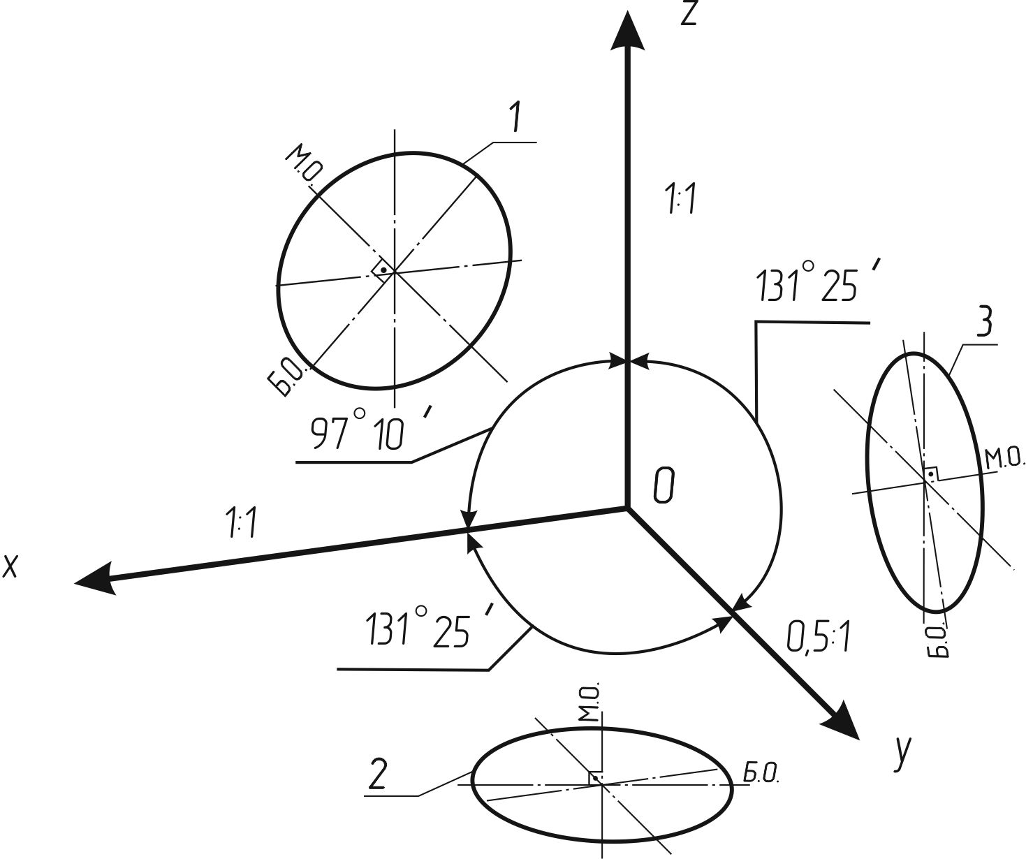 Рисунок 120 1 - эллипс (большая ось расположена под углом 90° к оси OY); 2 - эллипс (большая ось расположена под углом 90° к оси OZ); 3 - эллипс (большая ось расположена под углом 90° к оси OX)