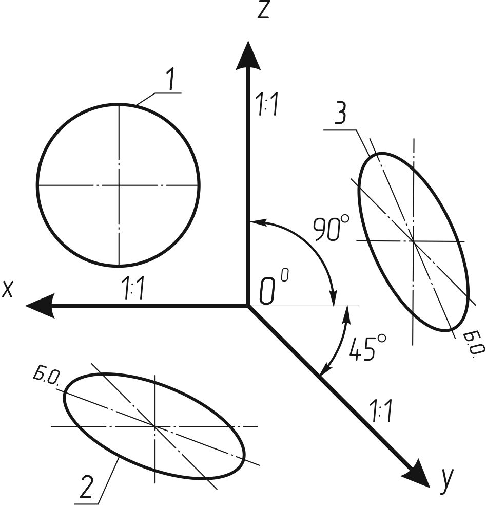 Рисунок 122 1 - окружность; 2 - эллипс (большая ось составляет с осью OX угол 22°30'); 3 - эллипс (большая ось составляет с осью OZ угол 22°30')