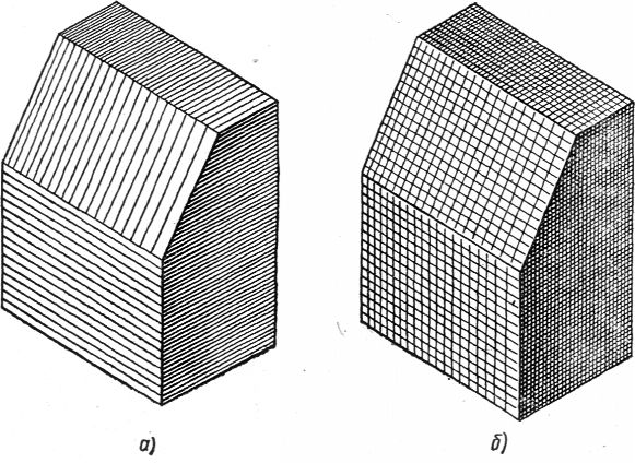 Шраффировка — это штриховка сеткой, или двойная штриховка. Шраффировку наносят на многогранниках и поверхностях вращения по форме предмета аналогично штриховке. Выполнение шраффировки требует от рисующего большой аккуратности, внимательности и точности исполнения. Оттенение шраффировкой многогранников выполняют сначала наклонными штрихами, параллельными осям x и y (рисунок 155, а). Потом рисуют тонкие вертикальные штрихи, а затем штрихи обводят более ярко с постепенным переходом к светлым местам предмета. Горизонтальные поверхности должны быть светлее поверхностей вертикальных, расположенных в теневых частях предмета (рисунок 155, б). Наклонные плоскости заштриховывают прямыми, параллельными наклону плоскости.