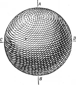 Оттенение шраффировкой сферической поверхности. Для оттенения шраффировкой сферической поверхности сначала наносят наклонную штриховку в виде меридианов шара, касательных к общей огибающей окружности. Затем рисуют горизонтальные штрихи-параллели. Горизонтальные штрихи наносят по тому же принципу, что и наклонные. Разница будет лишь в том, что для нанесения горизонтальных штрихов необходимо делить не наклонный, а вертикальный диаметр шара АВ (рисунок 157). Промежуточные эллипсы вырисовывают на глаз между основными.