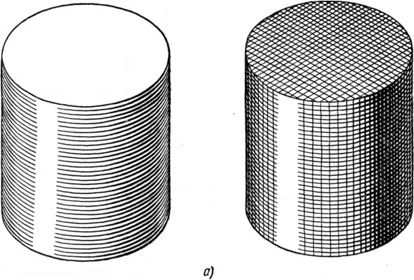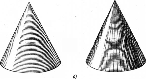 На цилиндре и конусе шраффировку выполняют сначала горизонтальными штрихами в виде эллипсов, касательных к образующим (рисунок 156 а и б), затем проводят вертикальные и наклонные штрихи.