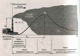Изменение концентрации загрязняющих веществ по мере удаления от устья источника загрязнения зависит от высоты и интенсивности перемешивания воздушных масс. По мере удаления от трубы концентрация по оси факела уменьшается, а размеры факела в перпендикулярном направлении к оси увеличиваются. Начальная точка соприкосновения струи загрязненного воздуха с поверхностью земли является началом зоны загрязнения, после этого концентрация ЗВ над поверхностью земли начинает нарастать, достигая максимума на расстояниях 10 – 40 высот трубы, что связано с выпадением из факела примесей, достигающих поверхности земли в данный момент, а также примесями, ранее достигшими земли и продолжающие свое движение по направлению ветра. Скорость ветра на установленной высоте, при которой приземная концентрация от источника примеси достигает максимального значения – называется опасной скоростью ветра. При штиле и малых скоростях ветра факел выброса поднимается на большую высоту и не попадает в приземные слои воздуха. При сильном ветре дымовой факел активно перемешивается с большим объемом воздуха. Таким образом, между штилем и высокой скоростью ветра есть такая опасная скорость ветра при которой дымовой факел, прижимаясь к земле на определенном расстоянии хм, создает наибольшую величину приземной концентрации см. После достижения максимального значения, концентрация ЗВ начинает сначала быстро, а потом медленно уменьшаться обычно обратно пропорционально расстоянию от источника. Максимальная концентрация прямо пропорциональна производительности источника и обратно пропорциональна расстоянию от источника. На рассеивание загрязняющих веществ влияет множество факторов. Прежде всего оно зависит от высоты трубы Н и от высоты подъема дымовых газов над устьем трубы. Высота подъема газов зависит от скорости выхода газовоздушной смеси w0. Вредные вещества распространяются по направлению ветра в пределах сектора, ограниченного довольно малым углом раскрытия факела вблизи выхода из трубы в 10 – 20 °. Если принять, что угол раскрытия не меняется с расстоянием, то площадь поперечного сечения факела должна возрастать пропорционально квадрату расстояния (факел уширяется). Сильное влияние на уровень приземной концентрации оказывает температурная стратификация атмосферы, т.е. вертикальное распределение температуры. В обычных условиях днем земная поверхность прогревается и за счет конвекционного обмена нагревает нижний приземный слой воздуха. В этих условиях по мере подъема вверх температура падает на 0,6 °С на каждые 100 м. Ночью при ясной погоде поверхность земли отдает тепло в окружающее пространство. Земная поверхность охлаждается и, одновременно охлаждает приземный слой воздуха, который остывает быстрее верхних слоев. В результате происходит инверсия (поворот) распределения температур. Температура воздуха с высотой повышается. При обычном градиенте температур, создаются благоприятные условия для «всплывания» выбросов, восходящие потоки более теплого воздуха интенсифицируют перемешивание газов. В условиях инверсии эти процессы ослабляются, что способствует накоплению примесей в приземном слое. Вредные вещества, выбрасываемые с дымовыми газами, переносятся и рассеиваются в атмосфере в зависимости от метеорологических, климатичес