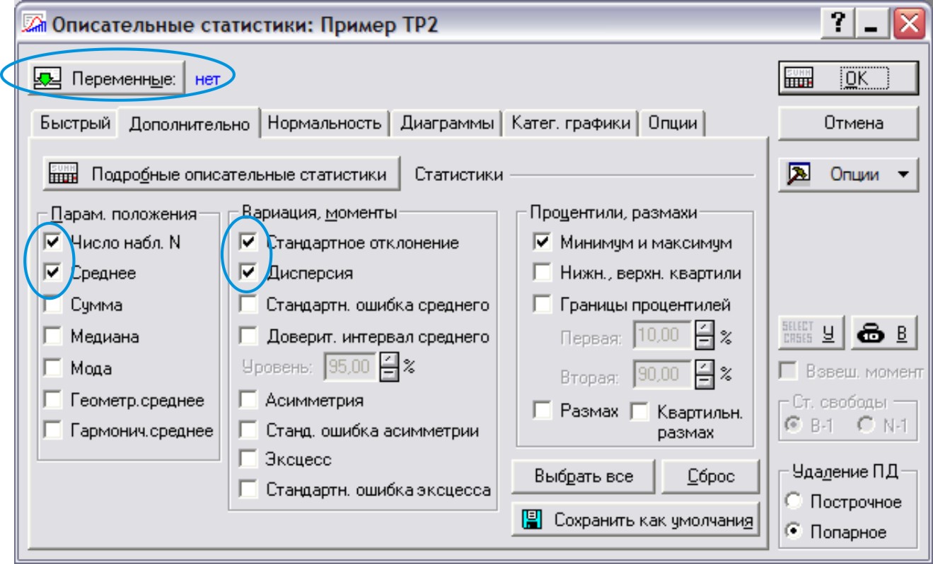 Вернулись в стартовое окно. В нем необходимо отметить основные статистические характеристики: Число наблюдений, Среднее, Стандартное отклонение, Дисперсия.(рис.1) → ОК