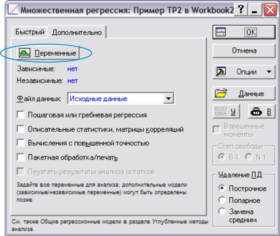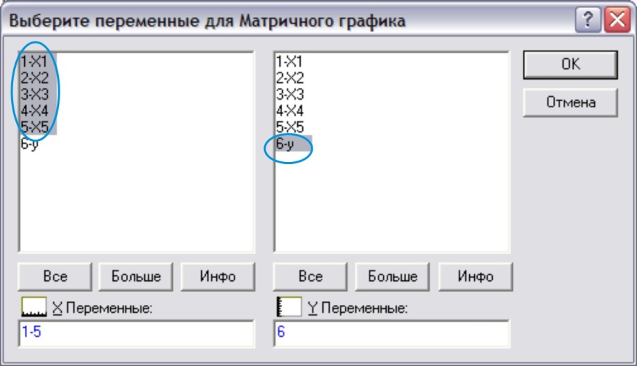 Рис.10. Появится окно выбора переменных, в котором следует указать независимые переменные (все Xi) – в левой части окна, и зависимую – Y – в правой. ОК. (рис. 11)