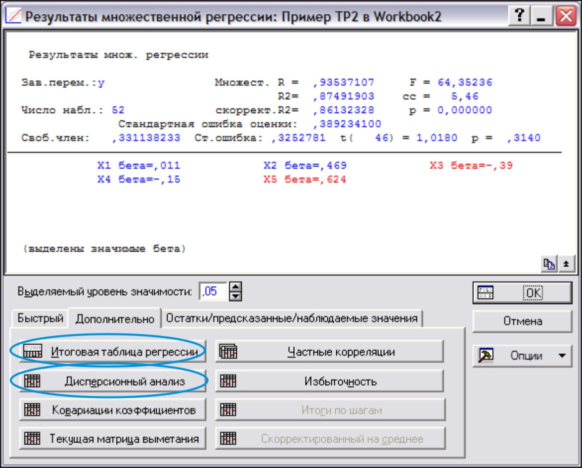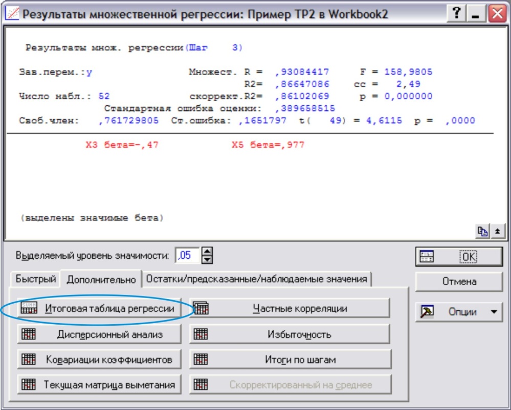 Для анализа построенной модели выведем результаты – кнопка Итоговая таблица регрессии. В результате Statistica выдает две таблицы: Итоговые статистики и Итого регрессии
