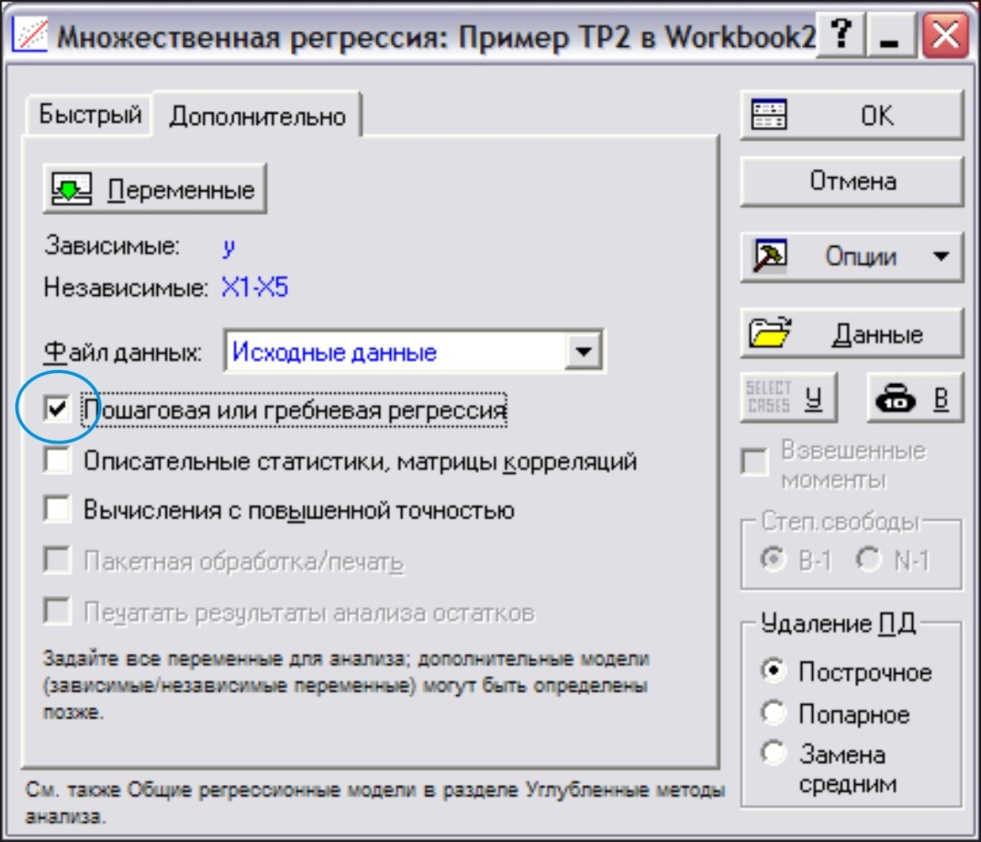 Вызовем модуль Множественная регрессия, определим, как и при выполнении задания 2, зависимую и независимые переменные. Для выполнения пошаговой процедуры включения (исключения) факторов выставим флажок у опции Пошаговая или гребневая регрессия→ ОК (рис. 15)