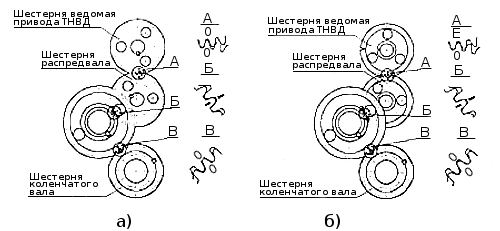 Схема установки шестерен привода агрегатов: а) — на двигатели с ТНВД, укомплектованными муфтой опережения впрыскивания топлива; б) — на двигатели с ТНВД без муфты опережения впрыскивания топлива. Механизм газораспределения приводится в действие от ведущей шестерни, установленной на коленчатый вал, через блок промежуточных шестерен, которые вращаются на сдвоенном коническом роликовом подшипнике, расположенном на оси, закрепленной на заднем торце блока цилиндров. Шестерня напрессована на конец распределительного вала, причем угловое расположение относительно кулачков вала определяется шпонкой. Шестерня привода ТНВД установлена на вал привода ТНВД увеличенной размерности. Поэтому вал привода ТНВД двигателей моделей 740.10 и 7403.10 не взаимозаменяем с валом привода двигателей моделей 740.11; 740.13 и 740.14. Шестерни устанавливаются на двигатель в строго определенном положении по меткам «Е», «0» и рискам, выбитым на шестернях, как показано на рис. стр. 10. Привод ТНВД осуществляется от шестерни, находящейся в зацеплении с шестерней распределительного вала. Вращение от вала к ТНВД передается через ведущую и ведомую полумуфты с упругими пластинами, которые компенсируют несоосность установки валов ТНВД и шестерни. С шестерней привода ТНВД находятся в зацеплении шестерни привода пневмокомпрессора и насоса гидроусилителя руля. Привод агрегатов закрыт картером маховика, закрепленным на заднем торце блока цилиндров. Справа на картере размещен фиксатор маховика, применяемый для установки угла опережения впрыскивания топлива и регулирования тепловых зазоров в механизме газораспределения. Ручка фиксатора при эксплуатации установлена в верхнем положении. В нижнее положение ее переводят при регулировочных работах, в этом случае фиксатор находится в зацеплении с маховиком. В верхней части картера маховика есть расточки, в которые устанавливаются пневмокомпрессор и насос гидроусилителя руля. Конструкция картера маховика выполнена под установку одноцилиндрового пневмокомпрессора. В картере маховика, в отличие от картера маховика, эксплуатируемого с двухцилиндровым пневмокомпрессором, отсутствуют вставка картера маховика и боковой подводящий масляный канал в пневмокомпрессор. Поэтому, установка на двигатель двухцилиндрового пневмокомпрессора возможна только с обязательной заменой картера маховика. По бокам картера маховика в средней части выполнены две бобышки с отверстиями диаметром 21,3 мм для слива масла из турбокомпрессора. Внизу в левой части картера имеется расточка, в которую устанавливается стартер. В середине картера выполнена расточка под манжету коленчатого вала. Со стороны заднего торца выполнена расточка под картер сцепления. В левой части картера маховика выполнен прилив с фланцем и люком для установки коробки отбора мощности от двигателя. При отсутствии коробки отбора мощности люк закрывается заглушкой, установленной на жидкую прокладку.