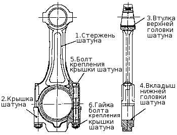 Установка упорных полуколец и вкладышей подшипников коленчатого вала: 1 — полукольцо упорного подшипника коленчатого вала верхнее; 2 — полукольцо упорного подшипника коленчатого вала нижнее; 3 — вкладыш подшипника коленчатого вала верхний; 4 — вкладыш подшипника коленчатого вала нижний; 5 — блок цилиндров; 6 — крышка подшипника коленчатого вала задняя; 7 — коленчатый вал. Крышки коренных подшипников (Рис. Установка крышек подшипников коленчатого вала) изготовлены из высокопрочного чугуна марки ВЧ50. Крепление крышек осуществляется с помощью вертикальных и горизонтальных стяжных болтов 3, 4, 5, которые затягиваются по определенной схеме регламентированным моментом. Установка крышек подшипников коленчатого вала: 1. Крышка подшипника коленчатого вала; 2. Коленчатый вал; 3. Болт крепления; 4. Болт стяжной крепления крышки подшипника левый; 5. Болт стяжной крепления крышки подшипника правый; 6. Шайба 7. Блок. Шатун (см. рис.) стальной, кованый, стержень 1 имеет двутавровое сечение. Верхняя головка шатуна неразъемная, нижняя выполнена с прямым и плоским разъемом. Шатун окончательно обрабатывают в сборе с крышкой 2, поэтому крышки шатунов невзаимозаменяемы. В верхнюю головку шатуна запрессована сталебронзовая втулка 3, а в нижнюю установлены сменные вкладыши 4. Крышка нижней головки шатуна крепится с помощью гаек 6, навернутых на болты 5, предварительно запрессованные в стержень шатуна. Затяжка шатунных болтов осуществляется по схеме определенной в приложении 8. На крышке и стержне шатуна нанесены метки спаренности - трехзначные порядковые номера. Кроме того на крышке шатуна выбит порядковый номер цилиндра.