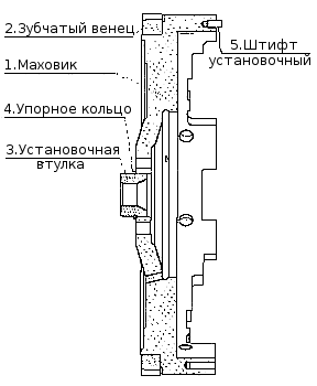 Рассматриваемые двигатели КамАЗ могут комплектоваться различными типами сцеплений. На рис. Маховик показан маховик для диафрагменного сцепления. Гаситель крутильных колебаний закреплен восемью болтами 2 (рис. Установка гасителя крутильных колебаний коленчатого вала) на переднем носке коленчатого вала. С целью исключения повреждения поверхности корпуса гасителя под болты устанавливается шайба 5. Гаситель состоит из корпуса (см. рисунок) в который установлен с зазором маховик. Снаружи корпус гасителя закрыт крышкой. Герметичность обеспечивается закаткой (сваркой) по стыку корпуса гасителя и крышки. Между корпусом гасителя и маховиком находится высоковязкостная силиконовая жидкость, дозированно заправленная перед заваркой крышки. Центровка гасителя осуществляется шайбой, приваренной к корпусу (рис. Гаситель крутильных колебаний коленчатого вала). Гашение крутильных колебаний коленчатого вала происходит путем торможения корпуса гасителя, закрепленного на носке коленчатого вала, относительно маховика в среде силиконовой жидкости. При этом энергия торможения выделяется в виде теплоты. При проведении ремонтных работ категорически запрещается деформировать корпус и крышку гасителя. Гаситель с деформированным корпусом или крышкой к дальнейшей эксплуатации не пригоден.