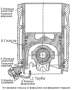 · Форсунки охлаждения (рис. Установка гильзы и форсунка охлаждения поршня) устанавливаются в картерной части блока цилиндров и обеспечивают подачу масла из главной масляной магистрали при достижении в ней давления 0,8 - 1,2 кг/см2 (на такое давление отрегулирован клапан, расположенный в каждой из форсунок) во внутреннюю полость поршней. · При сборке двигателя КамАЗ необходимо контролировать правильность положения трубки форсунки относительно гильзы цилиндра и поршня Контакт с поршнем недопустим.