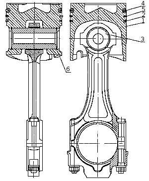 Поршень с шатуном (рис. Поршень с кольцами в сборе с шатуном) соединены пальцем 3 плавающего типа, его осевое перемещение ограничено стопорными кольцами 6. Палец изготовлен из хромоникелевой стали, диаметр отверстия 22 мм. Применение пальцев с отверстием 25 мм недопустимо, так как это нарушает балансировку двигателя.