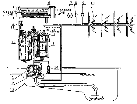 Схема смазочной системы двигателя: 1 — насос масляный; 2 — клапан; 3 — фильтр; 4 — перепускной клапан; 5 — частично-поточный фильтроэлемент; 6 — водомасляный теплообменник; 7, 8 и 9 — приборы контроля; 10 — форсунки охлаждения поршней; 11 — термоклапан; 12 — полнопоточный фильтроэлемент; 13 — картер масляный; 14 — клапан предохранительный. Из картера 13 масляный насос 1 подает масло в фильтр очистки масла 3 и через водомасляный теплообменник 6 в главную магистраль, и далее к потребителям. В смазочную систему также включены клапан системы 2, обеспечивающий давление в главной масляной магистрали 400-550 кПа (4,0-5,5 кгс/см2) при номинальной частоте вращения коленчатого вала двигателя, предохранительный клапан 14, отрегулированный на давление 931-1127 кПа (9,5-11,5 кгс/см2), перепускной клапан 4, отрегулированный на срабатывание при перепаде давления на фильтре 150-220 кПа (1,5-2,2 кгс/см2) и термоклапан 11 включения водомасляного теплообменника. При температуре масла ниже 95 °С, клапан открыт и основной поток масла поступает в двигатель минуя теплообменник. При температуре масла более 110 °С, термоклапан закрыт и весь поток масла проходит через теплообменник, где охлаждается водой. Тем самым обеспечивается быстрый прогрев двигателя после запуска и поддержание оптимального температурного режима в процессе эксплуатации. Конструктивно термоклапан расположен в корпусе масляного фильтра. Масляный картер штампованный, крепится к блоку цилиндров через резинопробковую прокладку. Момент затяжки болтов крепления картера 8 - 17,8 Н.м (0,8 - 1,8 кгс.м). Термоклапан включения водомасляного теплообменника состоит из подпружиненного поршня 13 с термосиловым датчиком 6. При температуре ниже 93 °С поршень 13 находится в верхнем положении и основная часть потока масла, минуя теплообменник, поступает в двигатель. При достижении температуры масла (95+2) °С омывающего термосиловой датчик 6, активная масса, находящаяся в баллоне, начинает плавиться и, увеличиваясь в объеме, перемещает шток датчика и поршень 13. При температуре масла (110+2) °С поршень 13 разобщает полости в фильтре до и после теплообменника и весь поток масла идет через теплообменник. При превышении температуры масла выше 115 °С срабатывает датчик температуры и на щитке приборов загорается сигнальная лампочка. Водомасляный теплообменник (рис. Фильтр масляный с теплообменником) установлен на масляном фильтре, кожухотрубного типа, сборный. Внутри трубок проходит охлаждающая жидкость из системы охлаждения двигателя, снаружи - масло. Со стороны масла трубки имеют оребрение в виде охлаждающих пластин. Поток масла в теплообменнике четыре раза пересекает трубки с водой, чем достигается высокая эффективность охлаждения масла. На двигатели 740. 11-240, 740.13-260 и 740.14-300 устанавливаются два типа теплообменников: