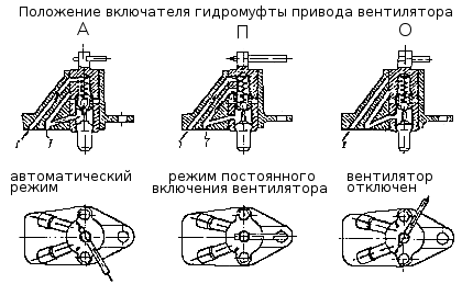 Включатель гидромуфты Включатель имеет три фиксированных положения и обеспечивает работу вентилятора в одном из режимов: