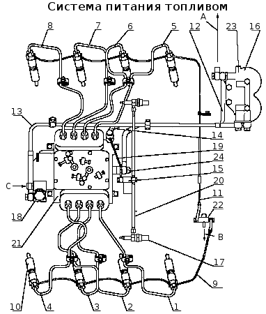 Система питания двигателя топливом: 1...8 — трубки топливные высокого давления; 9 — трубка топливная дренажная форсунок левых головок; 10 — форсунка; 11 — трубка топливная дренажная форсунок правых головок; 12 — трубка топливная отводящая ТНВД; 13 — трубка отводящая топливного насоса; 14 — трубка топливная подводящая ТНВД; 15 — клапан ЭФУ; 16 — фильтр тонкой очистки топлива; 17 — свеча факельная; 18 — топливоподкачивающий насос; 19 — трубка подвода топлива к клапану ЭФУ; 20 — трубка топливная от магнитного клапана к штифтовым свечам; 21 — ТНВД; 22 — тройник; 23 — клапан-жиклер; 24 — перепускной клапан ТНВД; А, В - слив топлива в бак; С - подвод топлива от фильтра грубой очистки топлива. На двигателях КамАЗ применена система питания топливом разделенного типа, состоящая из ТНВД мод. типа 337 с регулятором частоты вращения, топливоподкачивающим насосом, форсунок, фильтров грубой и фильтров тонкой очистки, насоса предпусковой прокачки, топливных трубок высокого и низкого давления, электромагнитного клапана и факельных свечей ЭФУ. Фильтр грубой очистки топлива и насос предпусковой прокачки топлива должны быть установлены в системе питания топливом объекта, на котором применяется двигатель. Топливо из бака подается через фильтр грубой очистки и насос предпусковой прокачки 18 топливоподкачивающим насосом в фильтр 16 тонкой очистки. Из фильтра тонкой очистки по топливной трубке низкого давления 14 топливо поступает в ТНВД 21, который в соответствии с порядком работы цилиндров распределяет топливо по трубкам 1-8 высокого дав ления к форсункам 10. Форсунки впрыскивают топливо в камеры сгорания. Избыточное топливо, а вместе с ним попавший в систему воздух через перепускной клапан ТНВД 24 по трубке 12 и клапан - жиклер 23 фильтра тонкой очистки отводится в топливный бак. Топливные трубки подразделяются на топливные трубки низкого давления - 0,4-2 МПа (4-20 кгс/см2) и высокого давления более 20 МПа (200 кгс/см2). Топливопроводы низкого давления изготовлены из стальной трубы сечением 10x1 мм с припаянными наконечниками. Топливные трубки высокого давления равной длины (1 = 615 мм), изготовлены из стальных трубок внутренним диаметром 2+0,05 мм путем высадки на концах соединительных конусов с обжимными шайбами и накидными гайками для соединения со штуцерами ТНВД и форсунок. Во избежание поломок от вибрации, топливные трубки дополнительно закреплены скобами к впускным коллекторам. Форсунка (см. рис. Форсунка) закрытого типа, с пятисопловым распылителем и гидравлическим управлением подъёма иглы мод. 273-31 для двигателя КамАЗ 740. 11-240. мод. 273-21 с распылителем ЯЗДА или мод. 273-51 с распылителем Bosch для двигателей 740. 13-260 и 740.14-300. Все детали форсунки собраны в корпусе 6. К нижнему торцу корпуса форсунки гайкой 2 присоединены проставка 3 и корпус 1 распылителя внутри которого находится игла 12. Корпус и игла распылителя составляют прецизионную пару. Распылитель имеет пять распыливающих отверстий. Проставка 3 и корпус 1 зафиксированы относительно корпуса 6 штифтами 4. Пружина 11 одним концом упирается в штангу 5, которая передает усилие на иглу распылителя, другим - в набор регулировочных шайб 9, 10.
