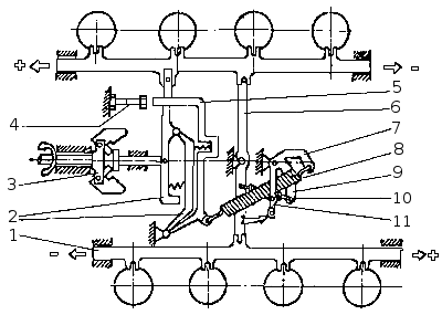 Схема работы регулятора частоты вращения: 1 — рейка ТНВД; 2 — рычаг муфты грузов; 3 — державка; 4 — регулировочный болт подачи топлива; 5 — рычаг регулятора; 6 — рычаг реек; 7 — рычаг пружины; 8 — пружина регулятора; 9 — рычаг стартовой пружины; 10 — стартовая пружина; 11 — рычаг управления регулятором. Во время работы регулятора центробежные силы грузов уравновешены усилием пружины 8. При увеличении частоты вращения коленчатого вала грузы, преодолевая сопротивление пружины 8, перемещают рычаг 2 муфты грузов с рейкой ТНВД - подача топлива уменьшается. При понижении частоты вращения коленчатого вала центробежная сила грузов уменьшается, и рычаг 2 с рейкой ТНВД под действием усилия пружины перемещается в обратном направлении - подача топлива и частота вращения коленчатого вала увеличиваются. Подача топлива прекращается поворотом рычага 3 (рис. Крышка регулятора ТНВД) останова двигателя до упора в болт 6. При этом рычаг 3, преодолев усилие пружины 8 (рис. Схема работы регулятора частоты вращения), через штифт 47 (рис. ТНВД) повернет рычаги 2 и 5, рейка переместится до полного прекращения подачи топлива.