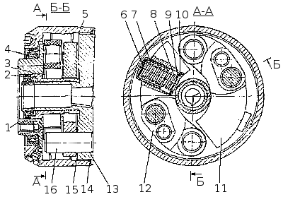 Автоматическая муфта опережения впрыскивания топлива: 1 — ведущая полумуфта; 2, 4 — манжета; 3 — втулка ведущей полумуфты; 5 — корпус; 6 — регулировочные прокладки; 7 — стакан пружины; 8 — пружина; 9, 15 — шайба; 10 — стопорное кольцо; 11 — груз с пальцем; 12 — проставка; 13 — ведомая полумуфта; 14 — уплотнительное кольцо; 16 — ось грузов. На двигателях мод. 740.11-240 и 740.14-300 применена муфта опережения впрыскивания повышенной энергоемкости с посадочным конусом 25 мм. Ведомая полумуфта 13 закреплена на конической поверхности переднего конца кулачкового вала ТНВД шпонкой и гайкой с шайбой, ведущая полумуфта 1 — на ступице ведомой (может поворачиваться на ней). Между ступицей и полумуфтой установлена втулка 3. Грузы 11 качаются на запрессованных в ведомую полумуфту осях 16 в плоскости, перпендикулярной оси вращения муфты. Проставка 12 ведущей полумуфты упирается одним концом в палец груза, другим - в профильный выступ. Пружина 8 стремиться удержать груз в положении упора во втулку 3 ведущей полумуфты. При повышении частоты вращения коленчатого вала двигателя (кулачкового вала ТНВД) грузы под действием центробежных сил расходятся, вследствие чего ведомая полумуфта поворачивается относительно ведущей в направлении вращения кулачкового вала, что вызывает увеличение угла опережения впрыскивания топлива. При понижении частоты вращения коленчатого вала (кулачкового вала ТНВД) грузы под действием пружин сходятся, ведомая полумуфта поворачивается вместе с валом насоса в сторону, противоположную направлению вращения вала, что вызывает уменьшение угла опережения впрыскивания топлива. ПриводТНВД усиленной конструкции (рис. Установка угла опережения впрыска топлива двигателей 740 .11 -240 и 740.14-300 или Установка угла опережения впрыска топлива двигателей 740.13-260 без муфты опережения впрыскивания топлива).