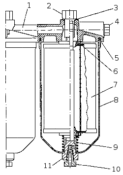 Установка угла опережения впрыскивания топлива двигателей мод. 740.11-240 и 740.14-300: 1 — корпус ТНВД; 2 — автоматическая муфта опережения впрыскивания топлива; 3 — полумуфта ведомая; 4 — вал приода; 5 — полумуфта ведущая; 6 — стяжной болт; 7 — шпонка; 8 — фланец центрирующий; 9 — втулка центрирующая; 10, 11 — набор пластин. В приводе устанавливается по 5 пластин задних и передних толщиной 0,5 мм каждая, изготовленных из стали 65 Г. Все болты в приводе ТНВД должны быть класса прочности R100 и заворачиваться с крутящим моментом 6,5-7,5 кгс.м. Затяжку всех болтов необходимо проконтролировать диометрическим ключом. Перед установкой болтов проверить наличие центрирующих втулок. Внимание! Шайбы пружинные устанавливаются только под гайки крепления пластин к полумуфте ведомой. Деформация (изгиб) передних и задних пластин не допускается. Стяжной болт ведущей полумуфты привода ТНВД затягивается в последнюю очередь. Фильтр тонкой очистки топлива (см. рис. Фильтр тонкой очистки) окончательно очищает топливо перед поступлением в ТНВД. Он установлен в самой высокой точке системы питания топливом для сбора и удаления в бак воздуха вместе с частью топлива, через клапан - жиклер, установленный в корпусе фильтра. При давлении в полости подвода топлива 25-45 кПа (0,25-0,45 кгс/см2) происходит сдвиг клапана, а при давлении 200-240 кПа (2-2,4 кгс/см2) клапан полностью открывается, обеспечивая перепуск топлива в бак.