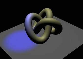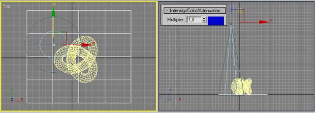 Свободный прожектор Free Spot отличается от только что рассмотренного источника Free Directional тем, что его лучи расходятся не параллельным пучком, а коническим, подобно свету реальных прожекторов, театральных софитов, карманных фонариков и т.п. Попробуем создать три таких источника, чтобы осветить плоскость с торусом (рис. 27) примерно так, как ее могли бы осветить разноцветные театральные софиты. Вначале установите слабый Omni-источник для общего освещения сцены (рис. 28). Затем добавьте первый свободный прожектор, например с лучами синего цвета и небольшими световыми конусами (в данном случае параметр Hotspot / Beam равен 10, а Falloff / Field —20) — рис. 29. Удобнее всего создавать прожектор в проекции Top, щелкая прямо по объекту, на который он должен быть направлен. В итоге визуализированная сцена станет напоминать рис. 30. Точно таким же образом создайте еще два цветных прожектора (красный и зеленый) с теми же самыми параметрами, а затем отрегулируйте положение всех трех прожекторов в окнах проекций, например так, как показано на рис. 31. Установите для каждого из источников флажок Shadows для генерации теней и визуализируйте сцену (рис. 32). Поскольку тени выглядят слишком черными, уменьшите их плотность (Dens) в свитке Shadow Parameters примерно до 0,3-0,4 (рис. 33).