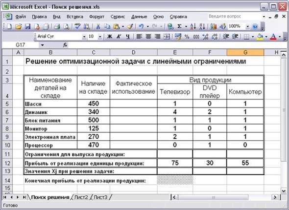Анализ результатов: После того, как будет получено решение, требуется проанализировать результаты. Анализ помогает выработать управленческое решение, направленное на дальнейшую стратегию деятельности предприятия. Принятие решения о производственной программе может быть направлено на то, что следует изменить некоторые условия, например, предприятие производитель имеет обязательства перед потребителем о поставке в текущем периоде 15 телевизоров. Следовательно, условие в ячейке E13 должно быть изменено (вместо 1 следует установить 15). Принятие решения о закупках комплектующих проводится в соответствии с полученным результатом, из которого видно, что при принятии программы выпуска номенклатуры изделий в соответствии с оптимальным планом потребуется определенное количество комплектующих. Принятие решения о цене, на выпускаемую продукцию, обосновывается при изменении прибыли (снижении цены на продукцию), для чего можно провести новые расчеты, изменив только величину прибыли от реализации единицы продукции.