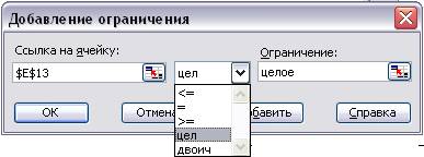 Ввести ограничения на форму представление результатов. В данной постановке задачи подразумевается, что количество изделий не может быть дробной величиной, а должны отображаться только целыми числами, следовательно, при выполнении расчетов, это обстоятельство необходимо учитывать. На рис. 6 показано диалоговое окно для добавления ограничений, в котором для ячейки E13 (в ней отображается количество единиц изделия), установлено условие ‘ цел ’, что означает целочисленное решение. В раскрывающемся списке выбирается необходимое условие.