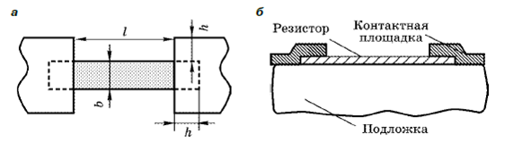 Тонкопленочный резистор с прямолинейной геометрией (см. рис. 2.1) изготовлен на диэлектрической подложке и состоит из резистивного материала шириной b, длиной l, и контактных площадок (КП) с величиной перекрытия резистивного слоя h для ликвидации влияния возможного рассовмещения слоев.
