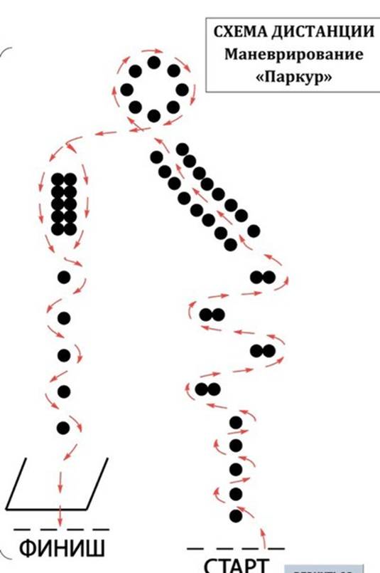 ДИСТАНЦИЯ МАНЕВРИРОВАНИЯ ПО ФИШКАМ «ПАРКУР». Вид соревнования, в котором спортсмены участники преодолевают дистанцию 100м объезжая фишки по схеме за максимально короткий промежуток времени. За каждую сбитую фишку или нарушение траектории езды, которая предусмотрена схемой дистанции, участник получает штрафные очки в виде дополнительных 0,5 секунд к финальному результату. Схема представлена ниже.
