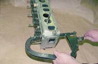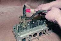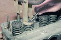 | Надавливая на тарелку клапана приспособлением, сжимаем пружину. Если тарелка “подклинивает”, допускается постукивание по упору рассухаривателя молотком.