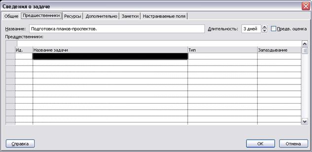 Назначать ресурсы задачам можно разными способами. Самый быстрый способ следующий. Выполнить команду Tools > Resourсes > Assign Resourсes или кнопка AssignResourсes (Назначение ресурсов) на панели инструментов. Появится диалоговое окно AssignResourсes. Теперь нужно пройтись по всем задачам, выполняя ввод значений в ячейку Units (Количество) для каждого ресурса, который пользователь планирует назначить для данной задачи. Введенная величина означает процент занятости ресурса в данной задаче. Имя назначенного ресурса появляется на диаграмме справа от соответствующей задачи. Теперь остается последнее действие: определить на диаграмме зависимости между задачами. Для этого выделите в списке задач две из них, которые связаны между собой, и нажмите кнопку LinkTasks (Связь задач) на панели инструментов – задачи на диаграмме окажутся соединенными линиями со стрелками и сдвинутся вправо. По умолчанию для связи задач Project использует зависимость Finish-to-start (Окончание-начало), т.е. вторая задача не начнется, пока первая не закончится. Если необходимо определить другой вид зависимости между задачами, выделите вторую задачу, и, щелкнув правой кнопкой мыши, выберите из контекстного меню команду TaskInformatio (Сведения о задаче). Появится диалоговое окно TaskInformation (Сведения о задаче). Раскройте вкладку Predecessors (Предшественники) и введите в поле ID номер задачи, которая является предшественницей данной (Рисунок 15.4). Если данная задача зависит от нескольких задач, их все необходимо перечислить в списке. Здесь же можно поменять тип зависимости, выбрав его из списка, и определить время перекрытия задач или задержку между ними (lag). В первом случае значение в столбце Lag (Запаздывание) должно быть отрицательным, а во втором – положительным.