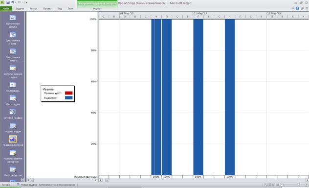 Второе представление, в котором просматривается загрузка ресурсов, это диаграмма ресурсов ResourceGraph (График ресурсов). На этой диаграмме можно проследить динамику загрузки каждого ресурса на протяжении всего проекта (Рисунок15.6).