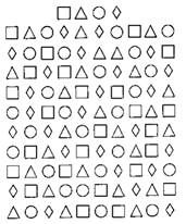 3) Цель методики: Определить уровень концентрации внимания, исследовать и оценить такие параметры внимания, как его устойчивость, возможность переключения, распределения. 4) Оборудование: Бланк методики с изображением геометрических фигур (4 типа фигур), расположенных на одинаковом расстоянии друг от друга в квадратной матрице 10x10. Простой карандаш средней мягкости (ТМ) и секундомер. 5) Инструкция: Тебе предложен тест с изображенными на нем квадратом, треугольником, кругом и ромбом. По сигналу "Начали" расставь как можно быстрее и без ошибок следующие знаки в эти геометрические фигуры: в квадрат – плюс, в треугольник – минус, в кружок – ничего не ставь и в ромб – точку. Знаки расставляйте подряд построчно. Время на работу отпущено 60 секунд. По моему сигналу "Стоп!" нужно прекратить расставлять знаки. 6) Обучающая помощь: Если ребенок затрудняется в выполнении задания после словесной инструкции, тогда исследователь берет чистый бланк методики и показывает ребенку, как выполнять задание, проговаривая: «Смотри, вот в этом квадратике я поставлю плюс, в треугольнике - вот такую черточку (минус), круг оставлю чистым, ничего в нем не нарисую, а в ромбе – точку. Все остальные фигуры ты заполнишь сам, точно так же, как я тебе показал» (еще раз повторить, где и что нарисовать - устно). 7) Анализ результатов: При анализе результатов необходимо установить причины, обусловившие данные результаты. Среди них важное значение имеет установка, готовность испытуемого выполнять инструкцию и обрабатывать фигуры расставляя в них знаки как можно скорее, или же его ориентации на безошибочность заполнения теста. В ряде случаев показатель концентрации внимания может быть ниже возможного из-за слишком большого желания ребенка показать свои способности, добиться максимального результата (то есть своего рода соревновательности). Причиной снижения концентрации внимания могут быть также состояние утомления, плохое зрение, болезнь. Анализируемые показатели