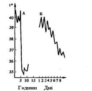 1. Стадія підвищення температури тіла. Характерною особливістю цієї стадії є переважання теплопродукції над тепловіддачею (А>Б). Не треба думати, що в цьому періоді втрачається контроль над регуляцією тепла. Навпаки, референтна температура “установочної точки” активно зміщується вгору, і всі механізми теплопродукції і тепловіддачі перебудовуються таким чином, щоб утримати температуру тіла на вищому рівні. Перш за все, обмежується тепловіддача, і цей механізм має вирішальне значення. Звужуються периферичні судини, зменшується приплив теплої крові до периферичних тканин, зменшується потовиділення і випаровування. Крім того, блокуються всі інші шляхи віддачі тепла – радіація, кондукція, конвекція. Відбувається скорочення м'язів волосяних цибулин, що збільшує теплоізоляцію і як результат – поява "гусячої шкіри". Збільшення теплопродукції досягається в результаті активізації обміну речовин у м'язах (скорочувальний термогенез) на тлі підвищеного тонусу м'язів і м'язового тремтіння. М'язове тремтінняпов'язане зі спазмом периферичних судин. Через зменшення припливу крові температура шкіри знижується іноді на кілька градусів. Терморецептори збуджуються, виникає відчуття холоду – остуда. У відповідь на це центр терморегуляції посилає еферентні імпульси до рухових нейронів – виникає тремтіння. Одночасно з цим підсилюється і нескорочувальний термогенез, тобто утворення тепла в органах, таких як печінка, легені, мозок. Це є результатом трофічної дії нервів на тканину, унаслідок якого активуються ферменти, збільшуються споживання кисню і вироблення тепла. У розбалансуванні теплового гомеостазу визначеальну роль можуть грати також гуморальні фактори. Відомо, що деякі бактеріальні токсини мають здатність роз'єднувати окислювання й окисне фосфорилювання і тим самим сприяти утворенню тепла. Цей додатковий термогенез може прискорити підвищення температури в I стадії лихоманки. 2. Температура тіла зростає до того часу, поки не досягне референтної температури “установочної точки”. На цьому рівні вона залишається певний час (години, дні), тобто настає стадія високого стояння температури. При цьому теплопродукція знову приходить у рівновагу з тепловіддачею (А = Б), хоча при більш високій, ніж у нормі, температурі. Хворий відчуває прилив тепла (жар). Підвищується не тільки температура внутрішніх органів, але й температура шкіри. Підтримка температури на підвищеному рівні зумовлюється тим, що під впливом лейкоцитарного пірогена змінюється “установочна точка” центра терморегуляції. На цьому рівні відновляється механізм підтримки сталості температури з характерними коливаннями ранком і ввечері, амплітуда яких значно перевищує таку в нормі. Новий рівень температури, її коливання протягом доби визначаються рядом факторів, серед яких вирішальне значення має кількість пірогенів і чутливість до них центрів терморегуляції. Крім того, має значення потужність системи віддачі тепла, точність і надійність функціональної і трофічної іннервації, утворення речовин-роз'єднувачів, і, нарешті, наявність в організмі енергетичного запасу матеріалу, насамперед жиру. У виснажених людей інфекційні хвороби можуть протікати без гарячки. У дітей вона розвивається швидко, у старих – повільно, до невисокого рівня. За ступенем підйому температ