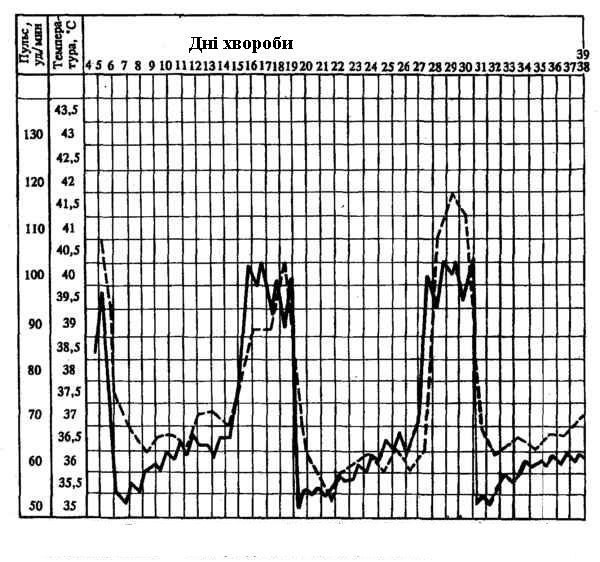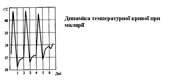 Динаміку зміни температури тіла під час гарячки можна зобразити у вигляді температурної кривої. Температурна крива при лихоманці завжди складається з трьох частин – підйому, високого стояння і зниження, але кожна з них, як і крива в цілому може мати свої особливості, що інформують лікаря про стан хворого і мають диференційно-діагностичне значення. Характер її залежить від особливостей збудника і від реактивності організму На характер температурної кривої можуть впливати біологічні особливості збудника, наприклад циклічність його розвитку в крові. У цьому відношенні показова температурна крива при малярії – інтермітуючого типу (febris intermittens). Так, при триденній малярії (malaria tertiana) приступи лихоманки виникають через день, відповідно до чого температура різко підвищується й утримується на висоті в період від 30 – 60 хв до 2 – 3 год, а потім повертається до вихідного рівня і навіть може бути нижче його.