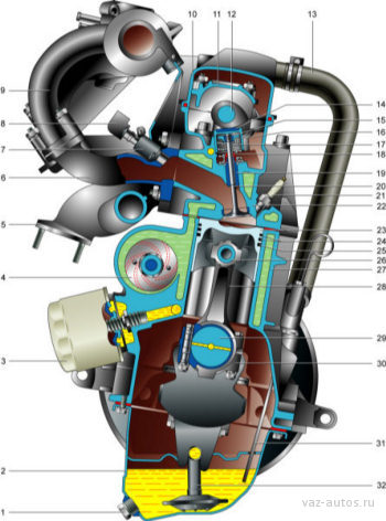 Бензиновый, четырехтактный, четырехцилиндровый, восьмиклапанный, рядный, с верхним расположением распределительного вала. Порядок работы цилиндров: 1–3–4–2, отсчет — от шкива коленчатого вала. Система питания — распределенный впрыск, управление двигателем —контроллер («Бош», «Январь» или «Джи-Эм»). Часть двигателей оснащается нейтрализатором отработавших газов. Двигатель с коробкой передач и сцеплением образуют силовой агрегат — единый блок, закрепленный в моторном отсеке на трех эластичных резинометаллических опорах. Справа по ходу автомобиля на двигателе расположены: приводы распределительного вала и насоса охлаждающей жидкости (зубчатым ремнем) и генератора (поликлиновым ремнем). Слева расположены: термостат, датчики температуры охлаждающей жидкости, стартер (на картере сцепления). Спереди: свечи и провода высокого напряжения, масляный щуп, шланг вентиляции картера, генератор (внизу справа), корпус воздушного фильтра (вверху слева). Сзади: ресивер, топливная рампа, форсунки, впускной и выпускной коллекторы, масляный фильтр. Блок цилиндров отлит из чугуна и не отличается от блока 21083. Цилиндры выполнены непосредственно в блоке. Номинальный диаметр — 82 мм, при ремонте он может быть увеличен на 0,4 или 0,8 мм. Класс цилиндра маркируется латинскими буквами на нижней плоскости блока в соответствии с диаметром цилиндра в мм: А — 82,00–82,01, В — 82,01–82,02, С — 82,02–82,03, D — 82,03–82,04, Е — 82,04–82,05. Максимально допустимый износ цилиндра 0,15 мм на диаметр. В нижней части блока цилиндров расположены 5 опор коренных подшипников коленчатого вала со съемными крышками, которые крепятся к блоку специальными болтами. Отверстия под подшипники обрабатываются в сборе с крышками, поэтому крышки невзаимозаменяемы и для отличия маркированы рисками на наружной поверхности. В средней опоре имеются гнезда для упорных полуколец, препятствующих осевому перемещению коленчатого вала. Спереди устанавливается сталеалюминиевое полукольцо (белого цвета), а сзади — металлокерамическое (желтое). При этом канавки на них должны быть обращены к коленчатому валу. Кольца поставляются номинального и увеличенного на 0,127 мм размеров. Если осевой зазор (люфт) коленчатого вала превышает 0,35 мм, то необходимо заменить одно или оба полукольца (номинальный зазор 0,06–0,26 мм). Вкладыши коренных и шатунных подшипников коленчатого вала — тонкостенные сталеалюминиевые. Верхние коренные вкладыши (устанавливаемые в блоке цилиндров) 1,2,4 и 5 опор — с канавкой на внутренней поверхности. Нижние коренные вкладыши и верхний коренной вкладыш третьей опоры — без канавки, такие же, как и шатунные вкладыши. Ремонтные вкладыши выпускаются под шейки коленчатого вала, уменьшенны на 0,25, 0,5, 0,75 и 1,00 мм. Коленчатый вал — из высокопрочного чугуна, имеет 5 коренных шеек и 4 шатунных. Вал снабжен восемью противовесами, отлитыми заодно с валом. Для подачи масла от коренных шеек к шатунным в нем просверлены каналы, закрытые запрессованными заглушками. Эти каналы служат также для очистки масла: под действием центробежной силы твердые частицы и смолы, прошедшие через фильтр, отбрасываются к заглушкам. Поэтому при любом демонтаже вала желательно, а при балансировке необходимо очищать каналы от скопившихся отложений. Заглушки повторно использовать нельзя — их заменяют новыми. На переднем конце (носке) 